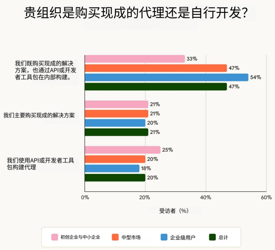 大多数组织(47%)采选羼杂形式来处理东说念主工智能智能体,将现成处置决议与定制组件相招引。约五分之一(21%)的组织齐备依赖预制智能体,而把握比例(20%)的组织则讹诈应用措施接口、开源模子或需要编码专科学问的设备用具包自行构建。