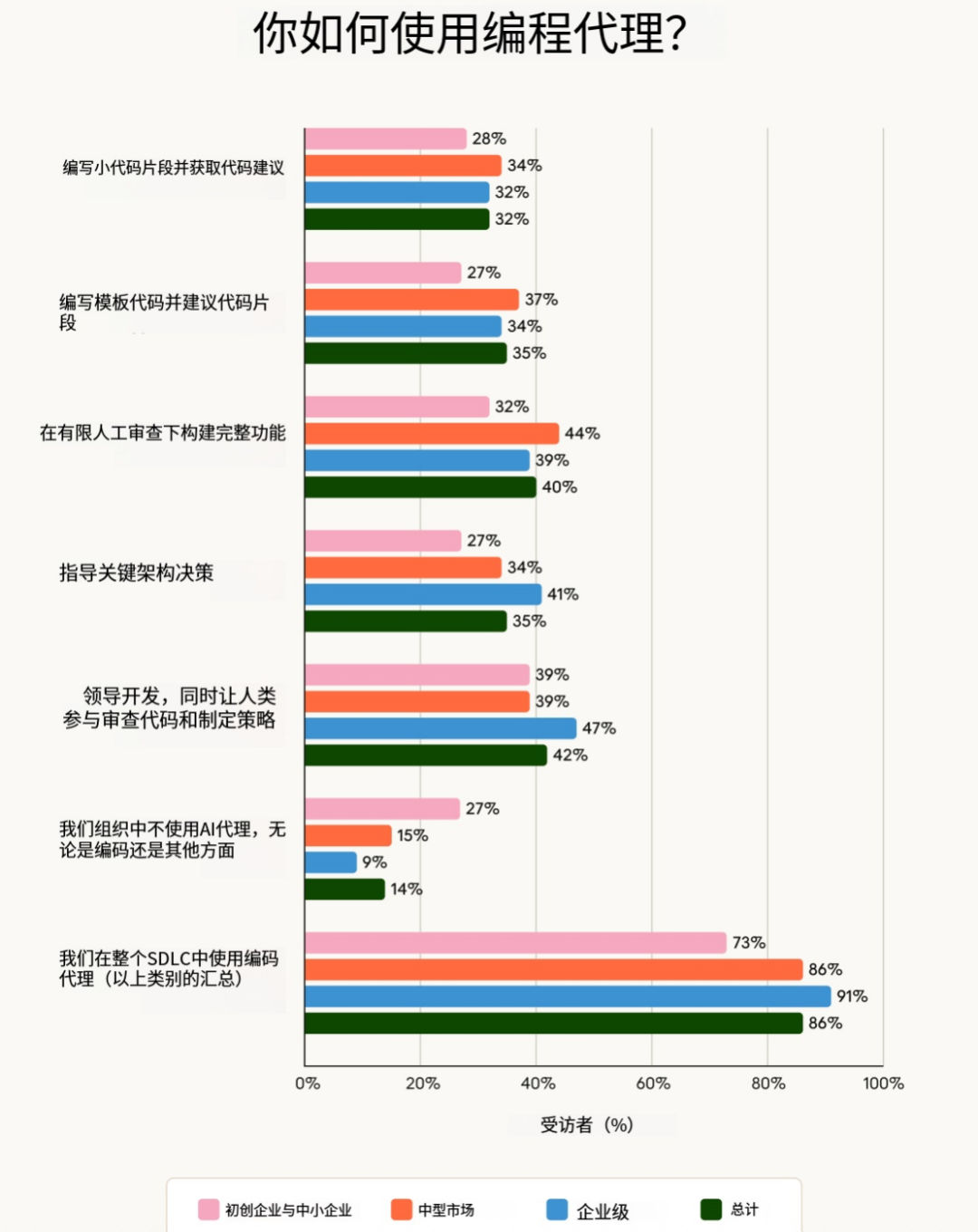 如今,卓著九成的组织都在使用东说念主工智能赞成编程。绝大多数(86%)的组织一经不再局限于检修阶段,而是将东说念主工智能编程智能体用于坐褥代码的设备,其中企业的采选率最初,达到 91%,而中微型企业的这一比例为 83%。42% 的组织信任这些智能体在东说念主类的监督下主导设备使命,这标识着工程团队的结构以及代码的编写形式正在发生要紧调遣。