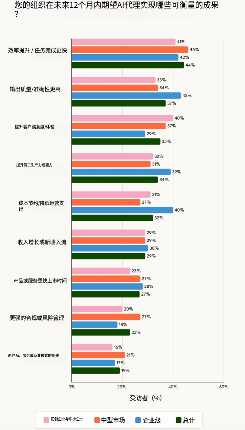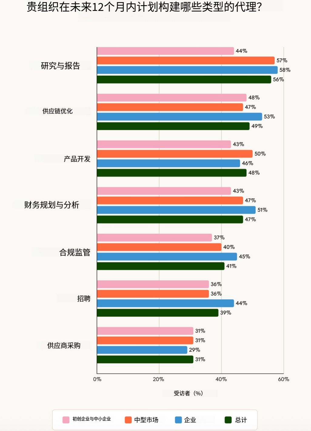 改日 12 个月,各组织渴望东说念主工智能智能体的应用能远远超出工程和信息本领职能。56% 的组织磋磨优先采选东说念主工智能智能体进行研究和论说使命,尤其是在中型阛阓和企业组织中,紧随自后的是供应链优化、居品设备和财务计算。磋磨应用场景的广度标明,东说念主们正从将东说念主工智能智能体视为特定部门的用具,转向将其视为企业级基础设施。