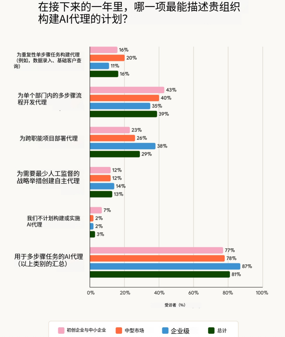 大多数组织(81%)磋磨在 2026 年检朴单的任务自动化转向更复杂的东说念主工智能技俩,其中企业在这一行变中处于最初地位,占比 87%,而中小企业为 78%。至于 “更复杂” 具体意味着什么:39% 的组织渴望设备约略处理多要领历程的智能体,29% 的组织磋磨部署智能体用于跨多个团队或部门的跨职能技俩。