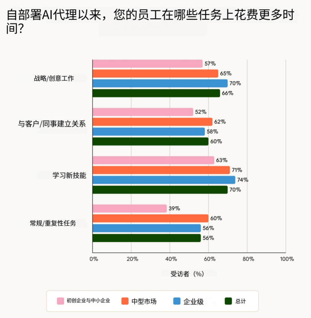 智能体正在改革职工的时辰分派形式 —— 更多地关注政策使命(66%)、东说念主际关连设备(60%)和技巧发展(70%),而非平日推论。