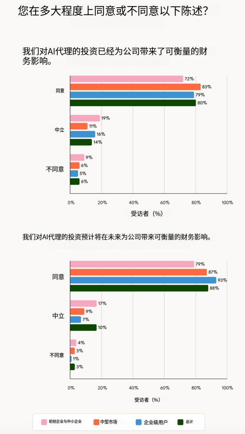 大多数组织(80%)论说称,他们在东说念主工智能智能体方面的投资面前一经产生了可估量的经济影响,而且对改日的信心更高 ——88% 的组织瞻望陈说将合手续或增长。这并非估量性的投资陈说率;大多数组织从其部署中看到了实实在在的生意价值。
