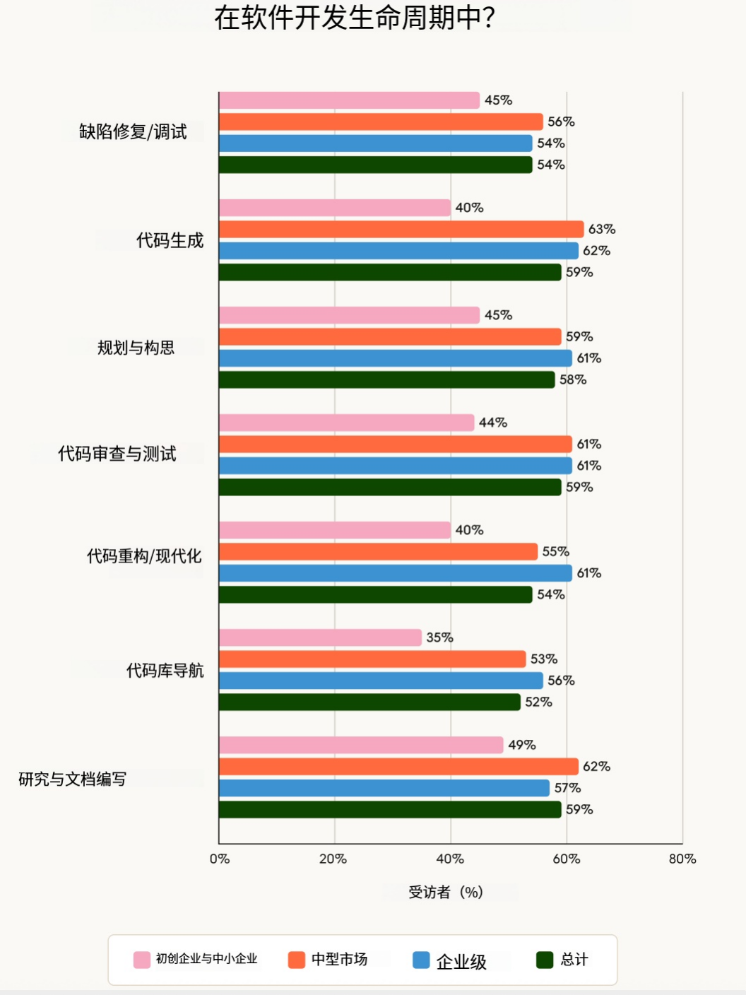 各组织论说称,东说念主工智能智能体在通盘设备生命周期中量入为主了更多时辰 —— 从计算和构想阶段(占 58%)到代码生成、文档编写、测试和审查阶段(均占 59%)。
