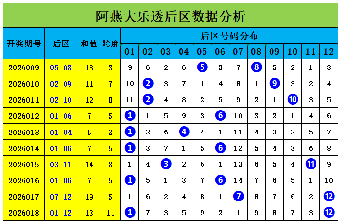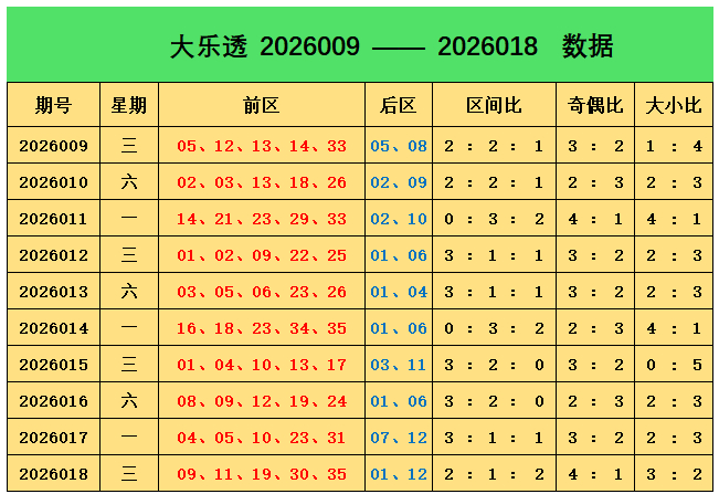 上期转头:大乐透第2026018期奖号为:前区09、11、19、30、35,后区01、12,前区奖号三区比为2:1:2,奇偶比为4:1,大小比为3:2,后区开出小大组合01、12