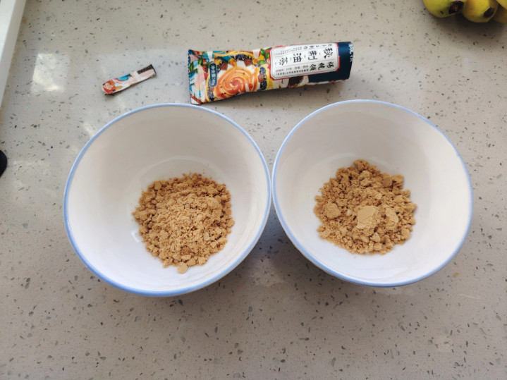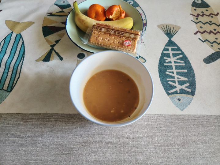 早上用滚水冲了半包油茶,大意20克,吃了一块饼干,大意30克,吃了一个香蕉和一个沙糖桔。
