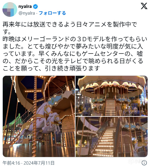 昨晚请使命主谈主员制作了旋转木马的3D模子。我颠倒可爱这种流光溢彩、如梦似幻的亮堂度。我由衷期待大众也能早日在电视上看到这种街机厅式的装假却又简直的光辉。