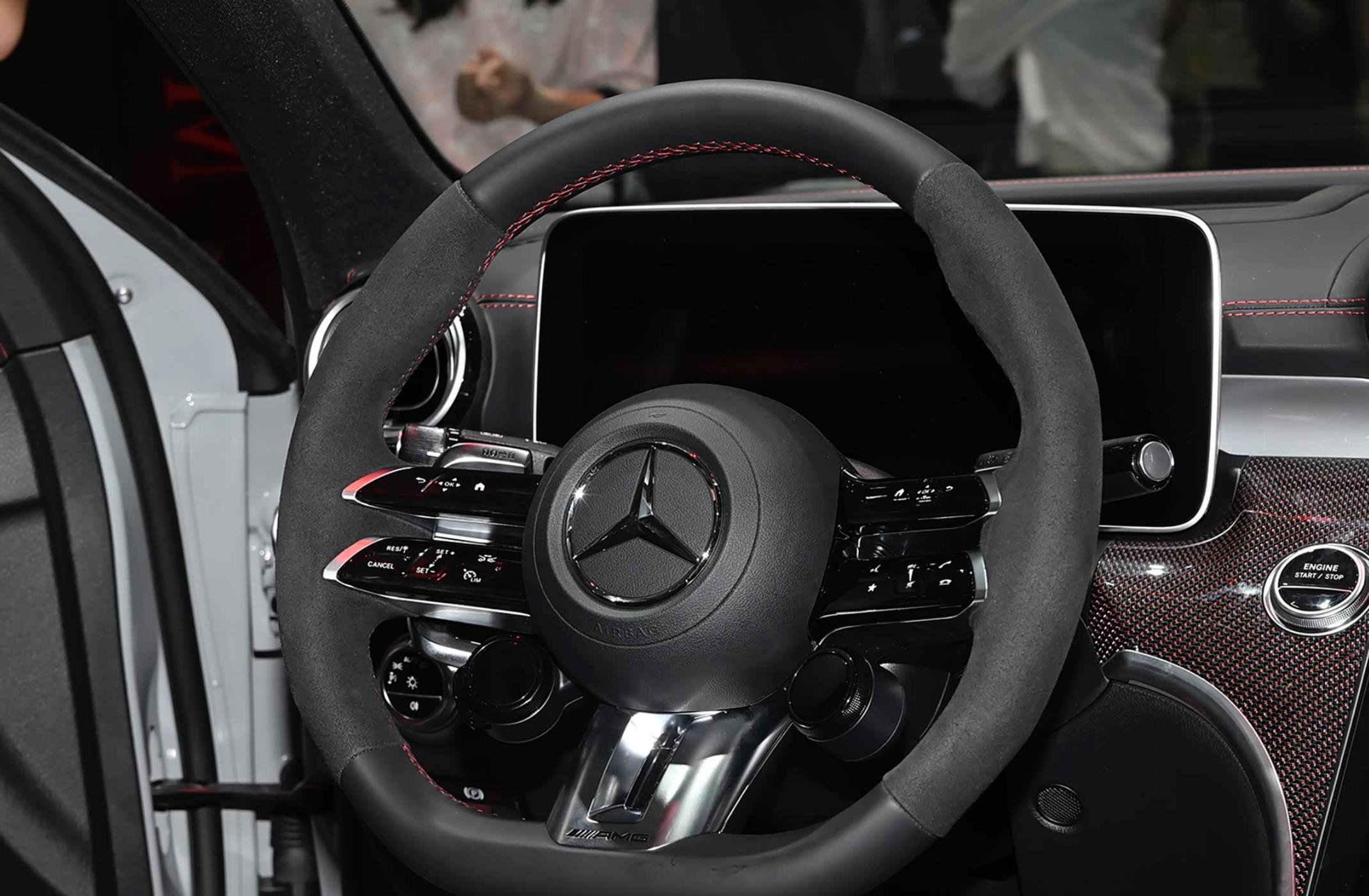 进入车内,梅赛德斯飞奔AMG C 63选择了大面积灰色Alcantara面料的包裹,并配有多半红色真皮皮革的点缀,还融入了碳纤维讳饰板和许多圆形元素的加执,前排配备了两个桶装赛车座椅,提供了更好的包裹和支执性,还不错遴荐四点式安全带。中控台像老老迈飞奔S63 L E Performance看皆。配备了12.3英寸的LCD全液晶仪容和12.8英寸的中控液晶大屏,仪容盘支执裸眼3D后果,搭配着HUD昂首深远屏还自带AR增强试验功能,后果酷炫。中控屏选择了OLED时期,划分率为1888×1728,带有振动反馈,进入了全新的数字化时间。