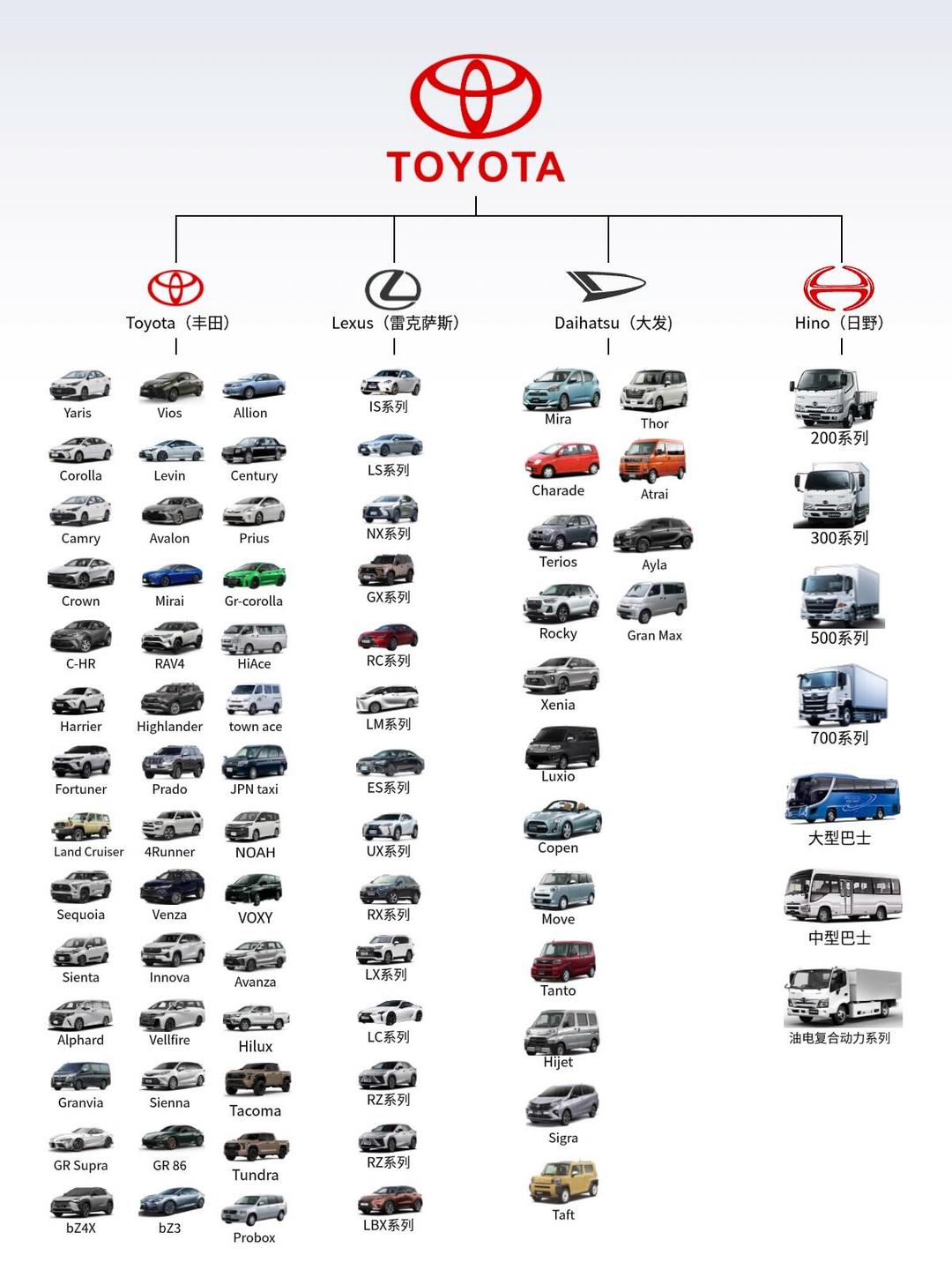 具体品牌为丰田、雷克萨斯合计销售1050万辆,大发汽车销售约70万辆,日野汽车销售约12万辆。