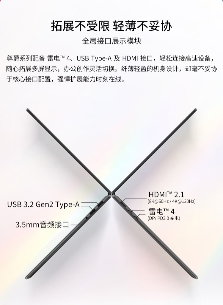 接口方面,尊爵 14 Flip AI+ 2026 款翻转本汲取了双雷电 4、双 USB 3.2 Gen2 Type-A、HDMI 2.1 及 3.5mm 耳机孔。