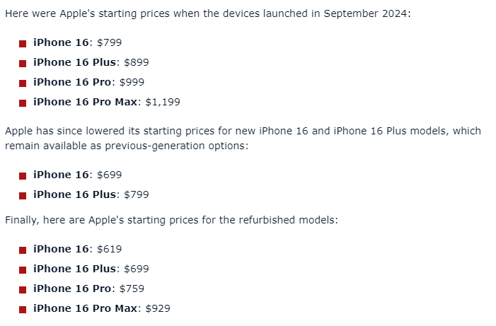 {jz:field.toptypename/}凭证苹果2024年9月发布时的订价,iPhone16起售价为799好意思元,iPhone16 Plus为899好意思元,iPhone16 Pro为999好意思元,顶配版iPhone16 Pro Max则高达1199好意思元。跟着新一代机型发布,苹果已将全新iPhone16和iPhone16 Plus的起售价隔离调度至699好意思元和799好意思元,而这次编削版的订价进一步下探:iPhone16起售价619好意思元,iPhone16 Plus为699好意思元,iPhone16 Pro降至759好意思元,iPhone16 Pro Max则为929好意思元。