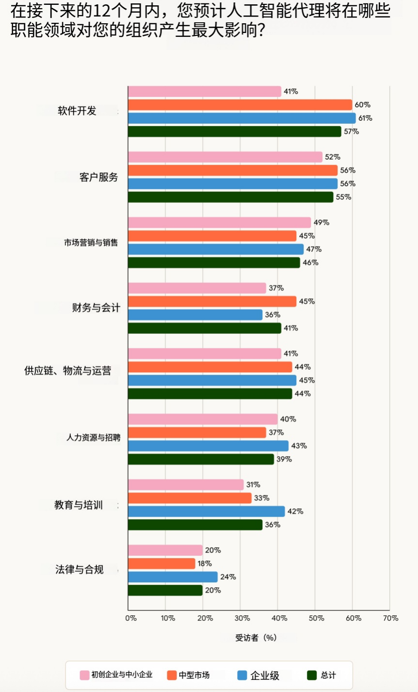 2026 年,软件开辟(57%)和客户管事(55%)瞻望将在短期内受到 AI 智能体的最大影响,紧随自后的是市集营销与销售(46%)以及供应链、物流和运营(44%)。