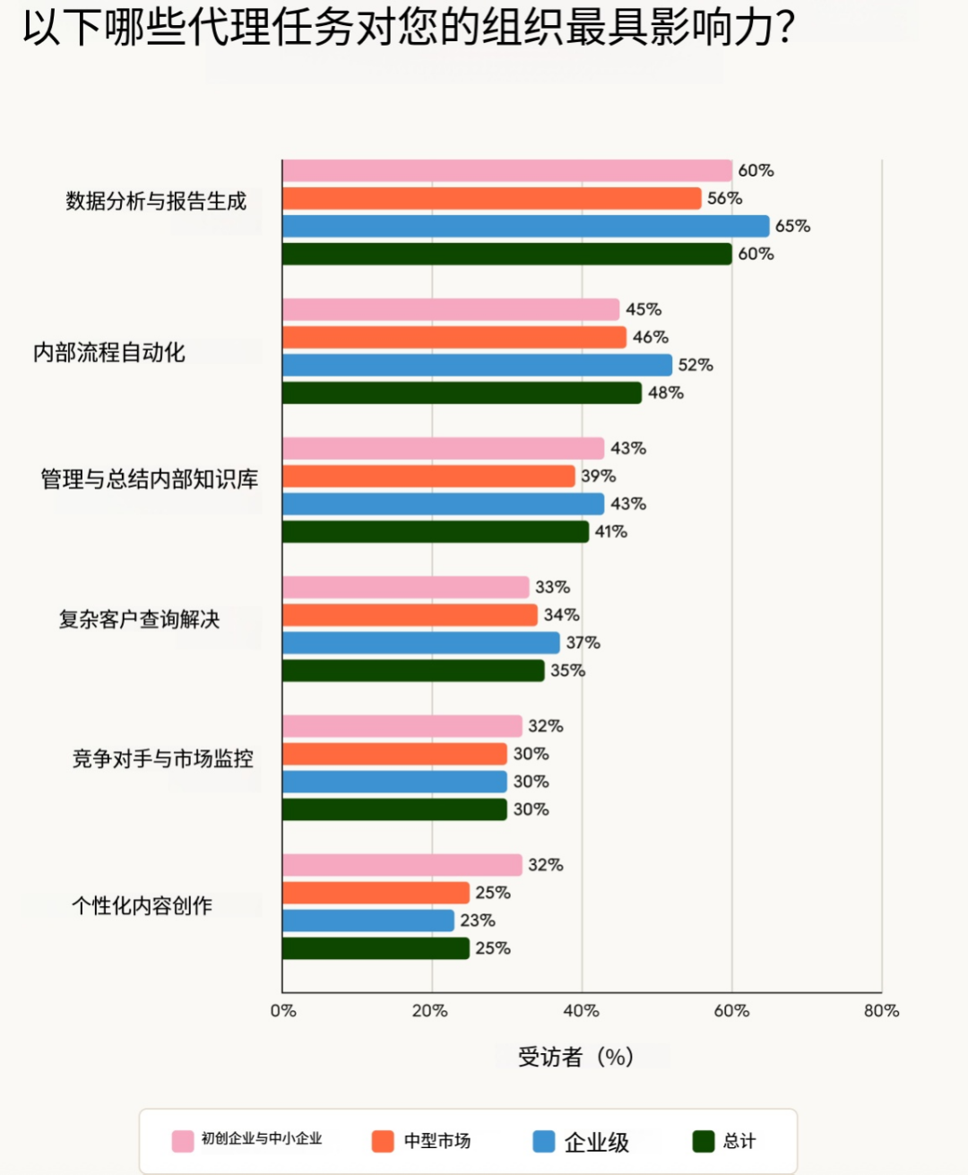 除了编码以外,影响最大的东说念主工智能智能体用例是数据分析和敷陈生成(60% 的东说念主暗示这是最具影响力的任务之一)以及里面历程自动化(48%)。企业对数据分析和敷陈生成尤为看好,65% 的企业以为这些是高影响力的应用。