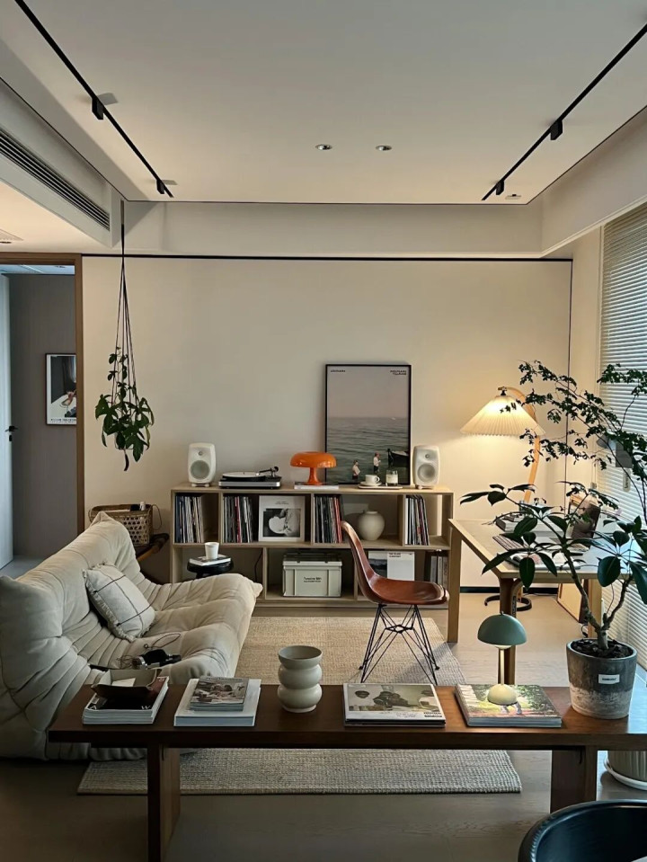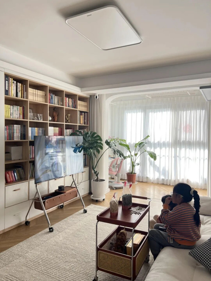 一面作念整墙书厨+储物,中间放安闲的沙发,电视用迁移支架。想看的时辰拉过来,不想看推到边缘,概况干脆用投影。茶几也不错换成几个生动的小边几,哪儿需要往哪儿搬。
