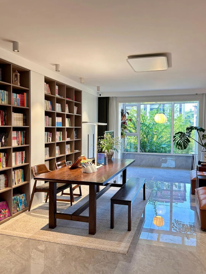 这张大长桌,既是餐桌,又是书桌,依然茶台,更是亲子互动区。