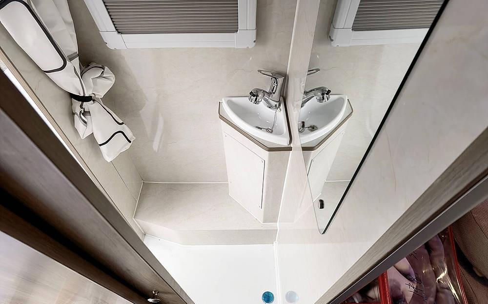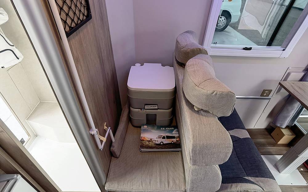 厨房位于车尾左侧,洗涮间则位于车尾右侧,配备了抽拉式淋浴花洒(兼水龙头)、便携式马桶、洗漱镜和30cm镜柜收纳柜,不错用来盛放洗漱用品。