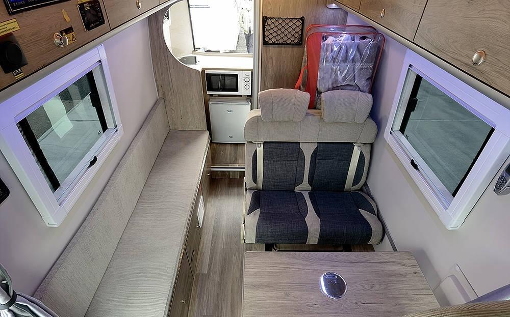 接下来便是生存区了,进门后往车尾处所看,不错看到一侧是长条沙发,沙发底部有许多储物格,不错高傲家庭收纳需求。一侧是两张座椅+一张升降桌。再往后走,便是厨房和洗漱间了。
